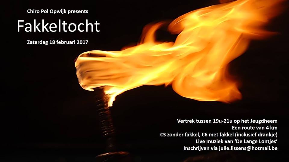 Branden jullie ook van verlangen om Opwijk City te verkennen by night? Kom dan zeker zaterdag 18 februari naar onze fakkeltocht! Met een fakkel in de hand maak je een tocht doorheen het dorp om onderweg even uit te rusten en te genieten van een drankje. Vertrekken kan tussen 19 en 21 uur. Voor de drie jongste groepen is er de mogelijkheid om te wandelen met de leidsters, we verzamelen om 19 uur! Inschrijven kan nog steeds door een mailtje te sturen naar julie.lissens@hotmail.be