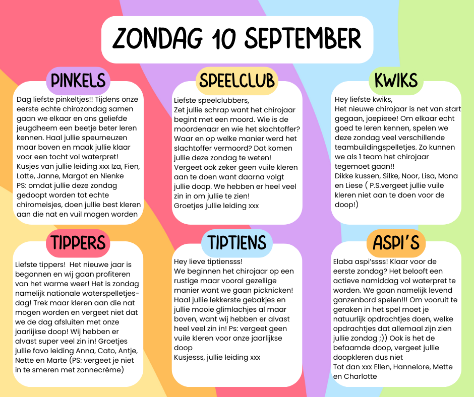 Na onze fantastische doop vorige week, staat er weer een keitoffe zondag op de planning! Deze zondag is het namelijk weer zo ver, Kadeekes in het park! Tijd om een hele namiddag plezier te maken op alle springkastelen en andere activiteiten! De oudste groepen mogen een centje meenemen om eventueel iets te eten of te drinken.