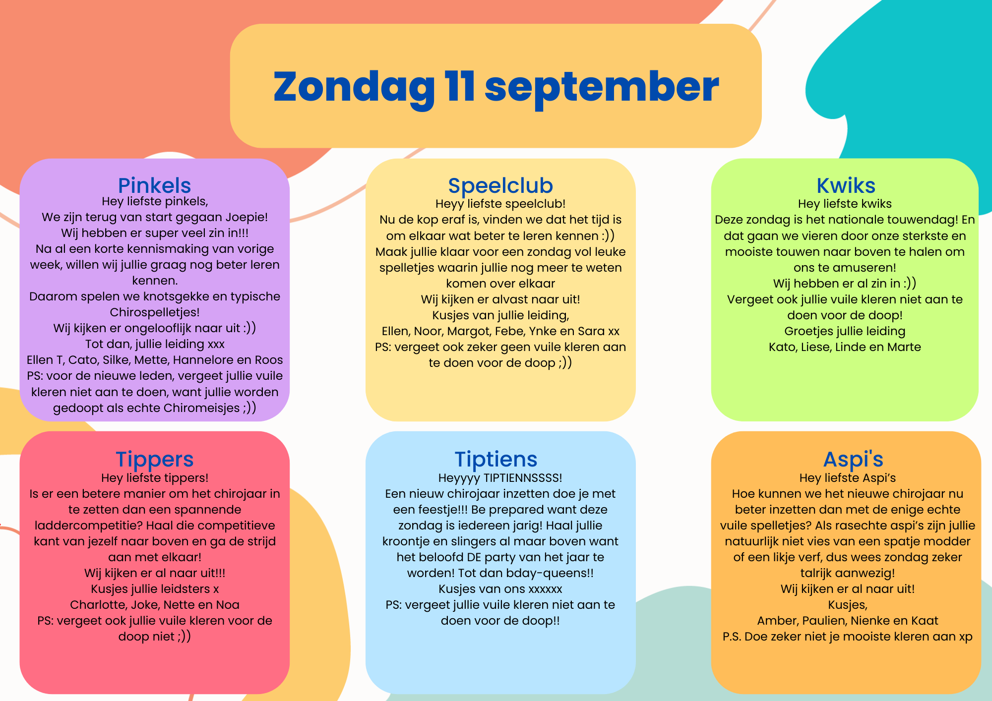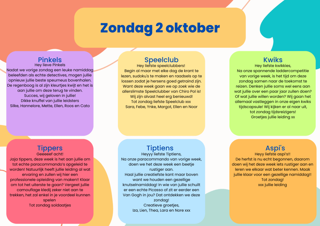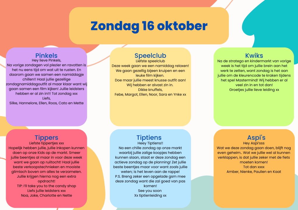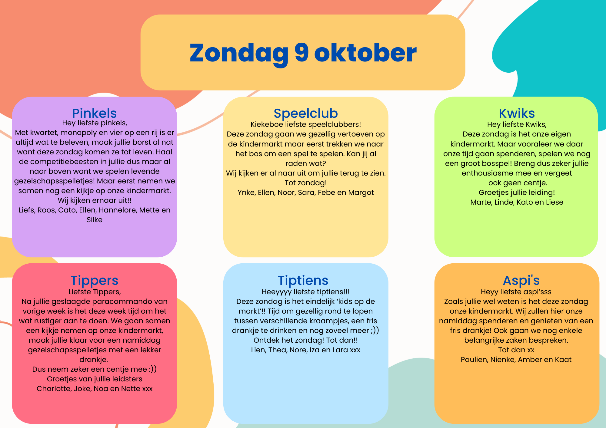 Deze week staan er weer super leuke activiteiten op de planning! En dat is niet het enige dat er te beleven valt deze zondag. Wij organiseren zondag ook ‘Kids op de markt’. Dit is een rommelmarkt waar Chiromeisjes oud speelgoed of kledij kunnen verkopen. Er is ook een terras met café waar je kan genieten van een fris drankje, een warme koffie en een klein hapje. Ons terras blijft open tot 17u30. Daarnaast zal er ook nog een groot springkasteel aanwezig zijn!