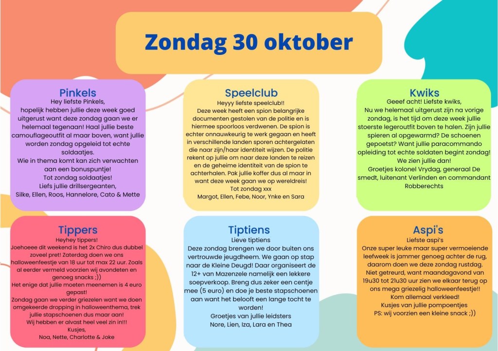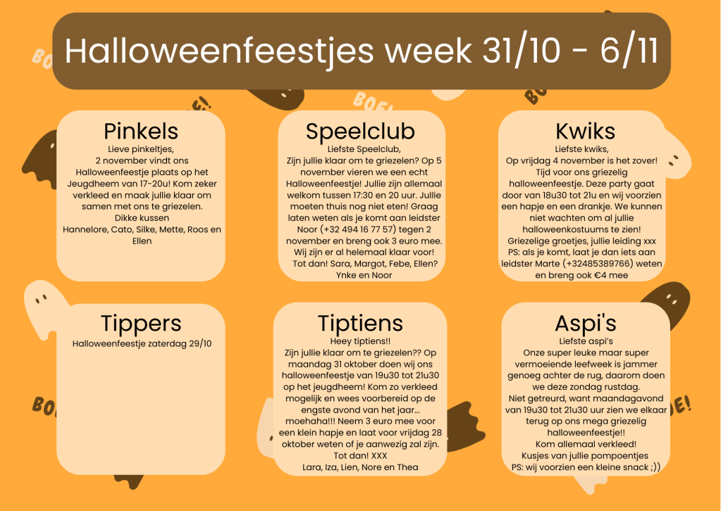 Volgende week zondag (6/11) zal het geen Chiro zijn, want tijdens de herfstvakantie heeft iedereen Halloweenfeestje. Kijk dus goed na wanneer jouw Halloweenfeestje is! In bijlage vind je de nieuwsbrief van deze week, en de nieuwsbrief voor de Halloweenfeestjes volgende week.